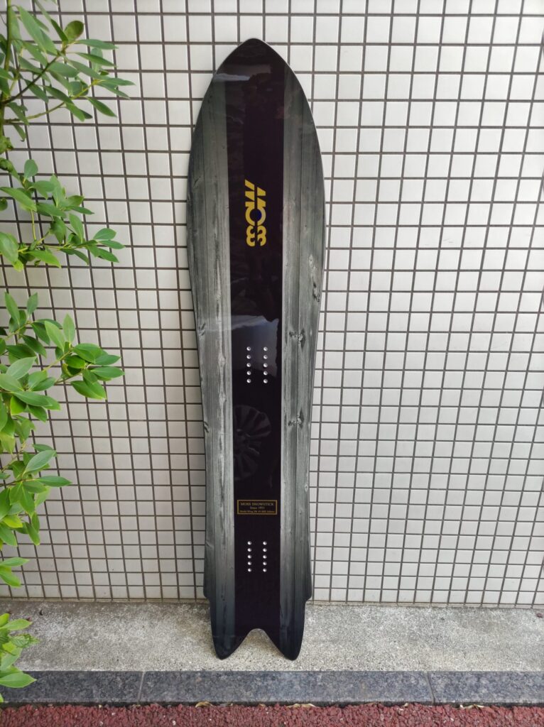 「mini speed board」。テール部分の窪みをwingと称し、このwing部分はエッジで滑走する”圧雪バーン”とソール面で滑走する”パウダー”での乗り味の違いが魅力です。ハイスピードでフォールラインを滑り降りる圧雪バーンと、俊敏で深く速いターンのパウダーのライディングフィーリングの違いが魅力の一つです。