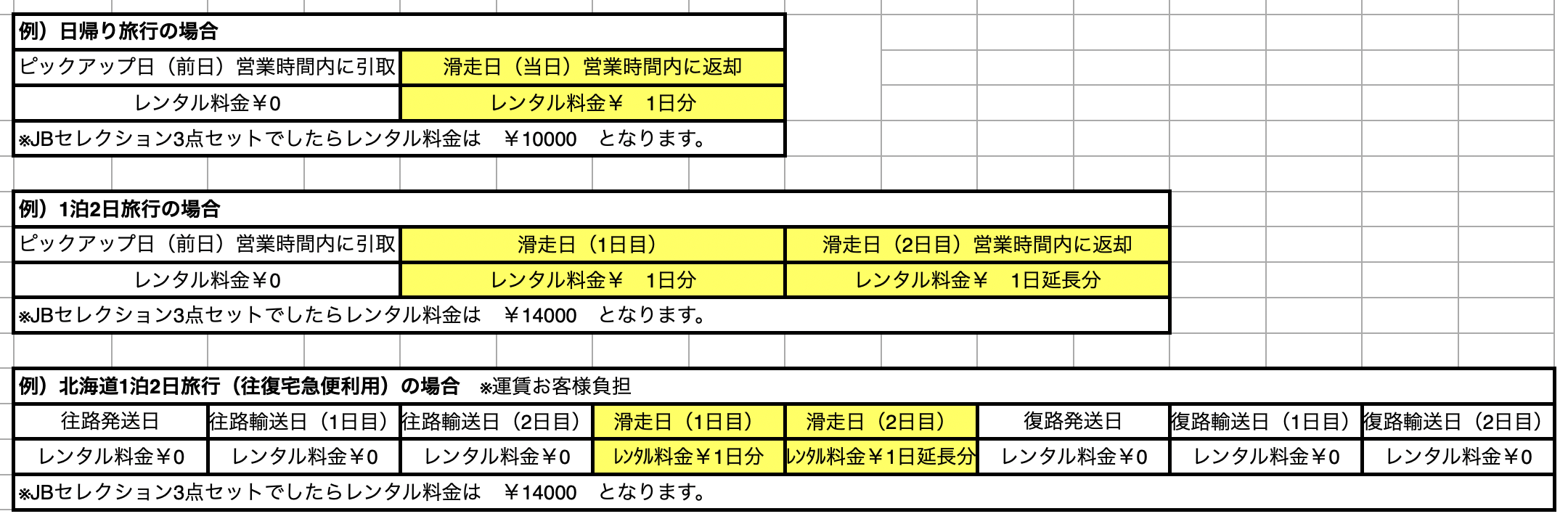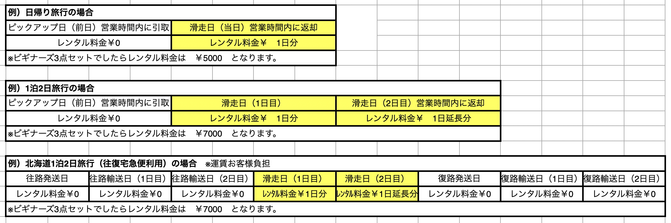 - レンタル料金は実際に滑走する日数分のみです。ピックアップの日、または輸送にかかる日数分はサービスとなり、レンタル日数にカウントされません。